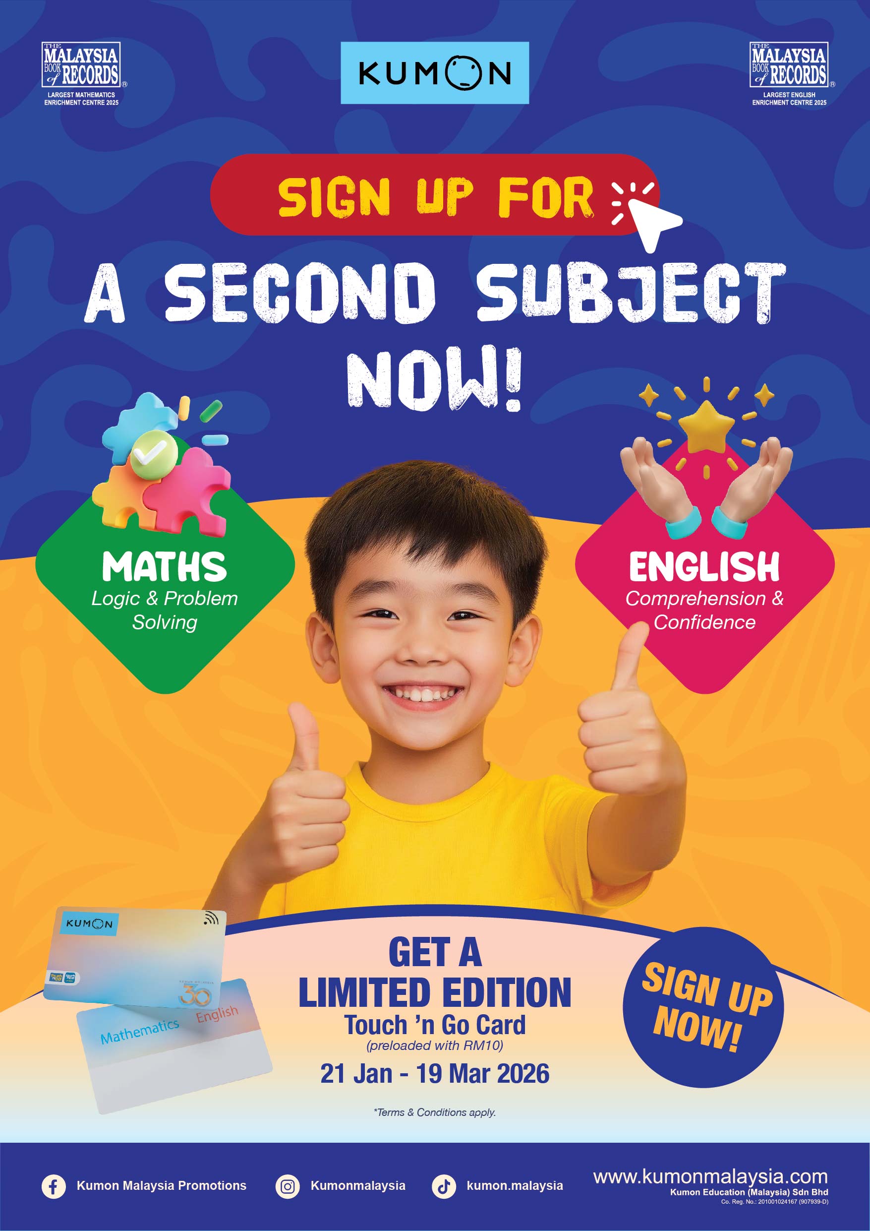 5. Eligible students will receive an exclusive Kumon Touch ‘n Go Card preloaded with RM10 upon successful enrolment in the second subject, while stocks last.